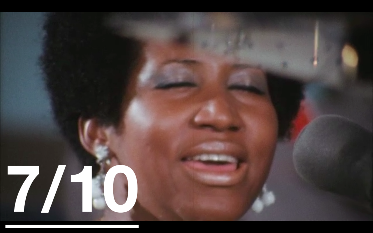 Visuellt är det verkligen inte mycket att höja ögonbrynen för. Det korniga fotot och den platta ljudmixen leder inledningsvis till oroliga föraningar om vad som komma skall. Det är också på sin plats att klargöra är att jag inte heller är någon expert då det kommer till Franklins musik eller långa karriär. Men så fort inspelningen och musiken sätter igång så transporteras vi till ett musikaliskt Shangri-La. Det spelar ingen som helst roll att ljudkvalitén är undermålig och att det finns både smuts och repor på negativen, Sydney Pollack har fångat något rent magiskt på film.